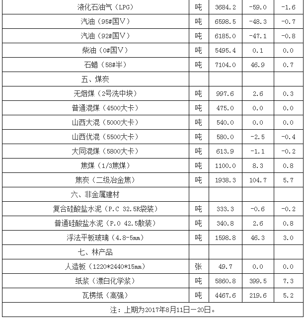 流通領(lǐng)域重要生產(chǎn)資料市場(chǎng)價(jià)格變動(dòng)情況(2017年8月21日—30日)